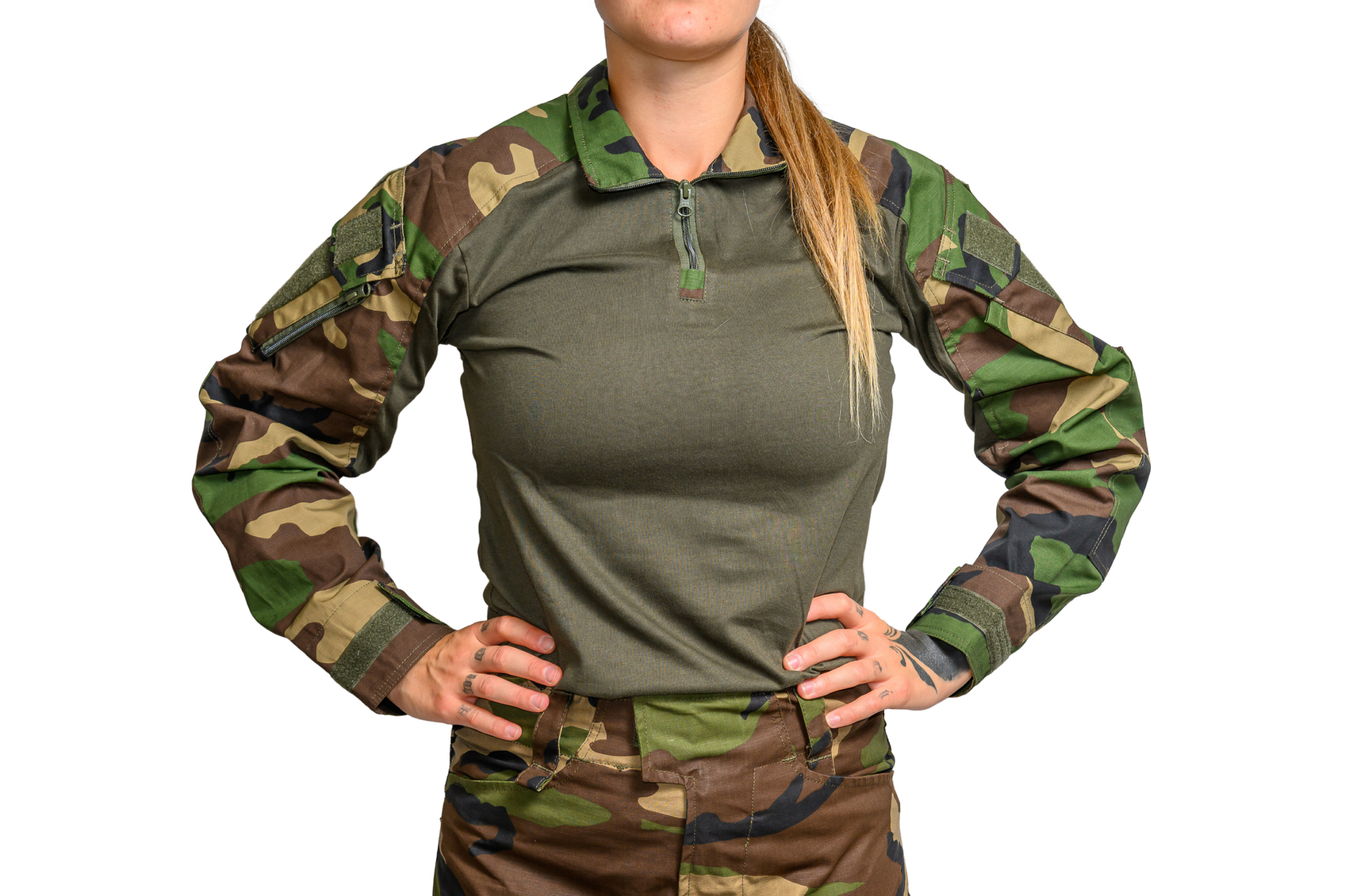 Ärmel und Schulterbereiche bestehen aus robustem, reißfestem Ripstop-Gewebe und bieten effektiven Schutz vor Abrieb, Vegetation, Insekten sowie BB-Treffern.