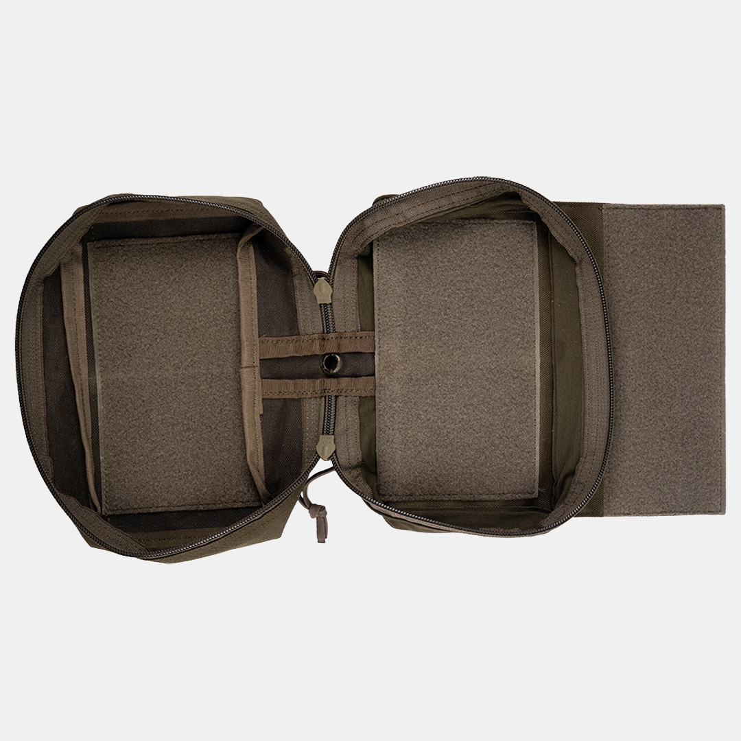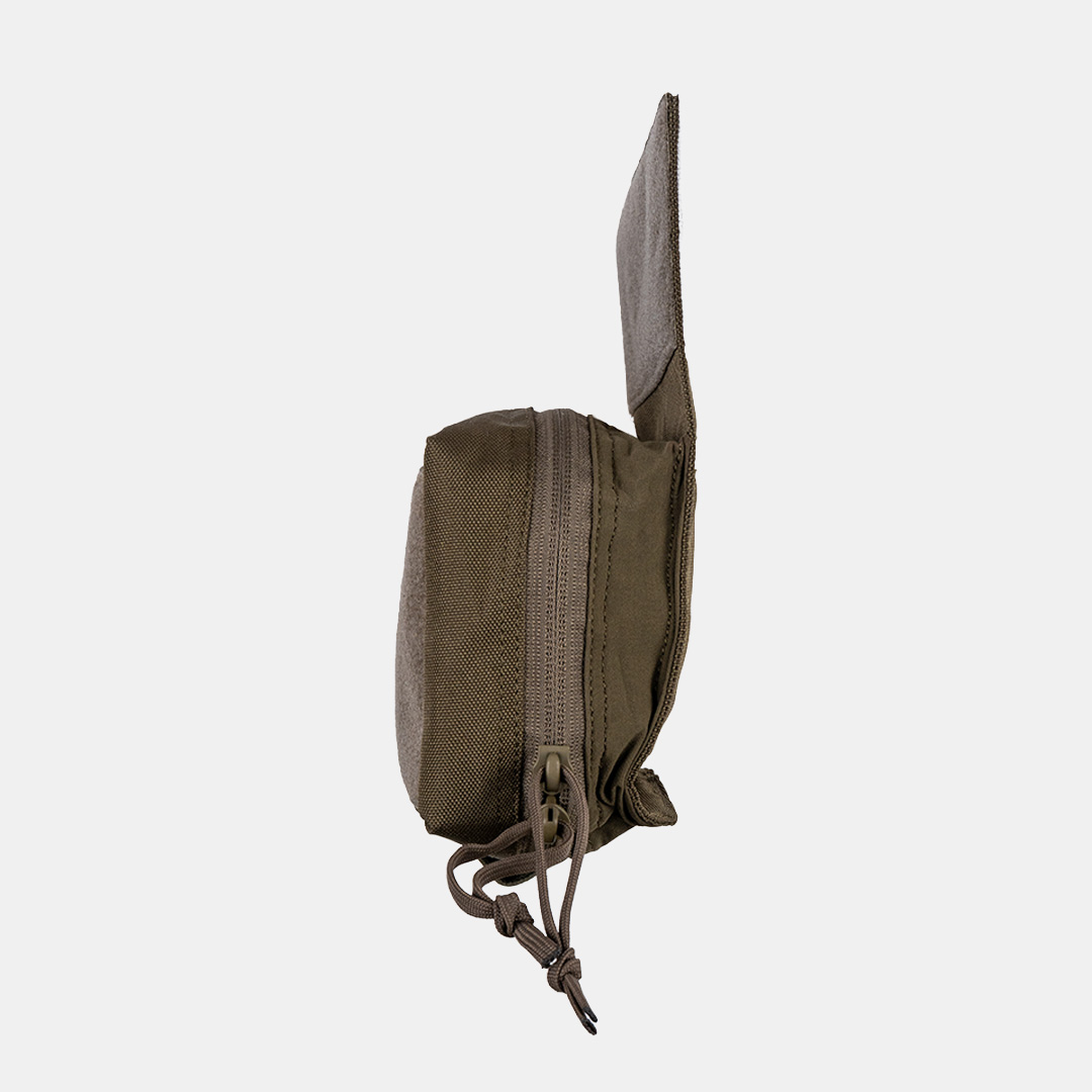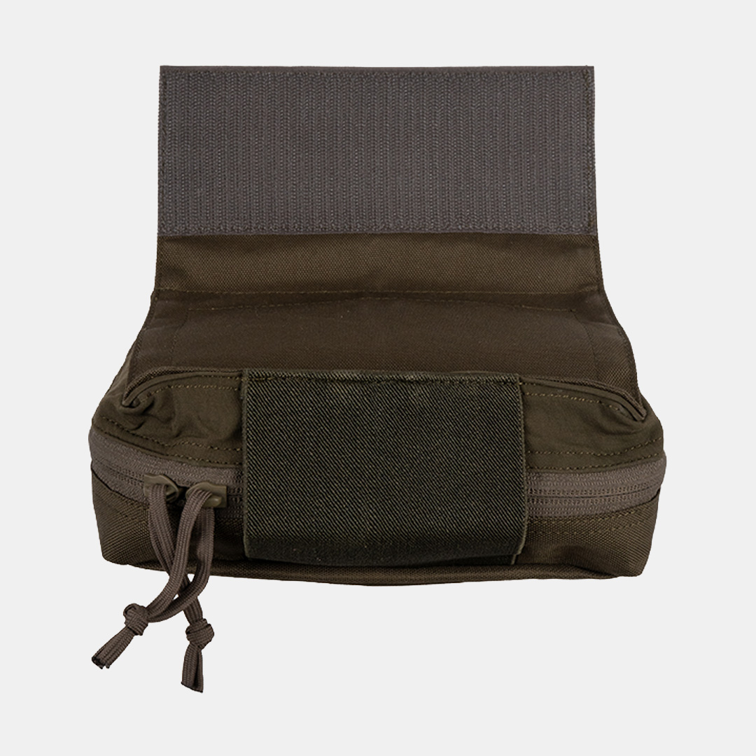 Der Reißverschluss sorgt für sicheren Verschluss, während die Klettfläche im Inneren eine übersichtliche Organisation ermöglicht. Auf der Vorderseite befindet sich eine Klettfläche für Patches oder Kennzeichnungen. Das elastische Band an der Unterseite bietet zusätzliche Befestigungsmöglichkeiten für kleine Ausrüstungsgegenstände.