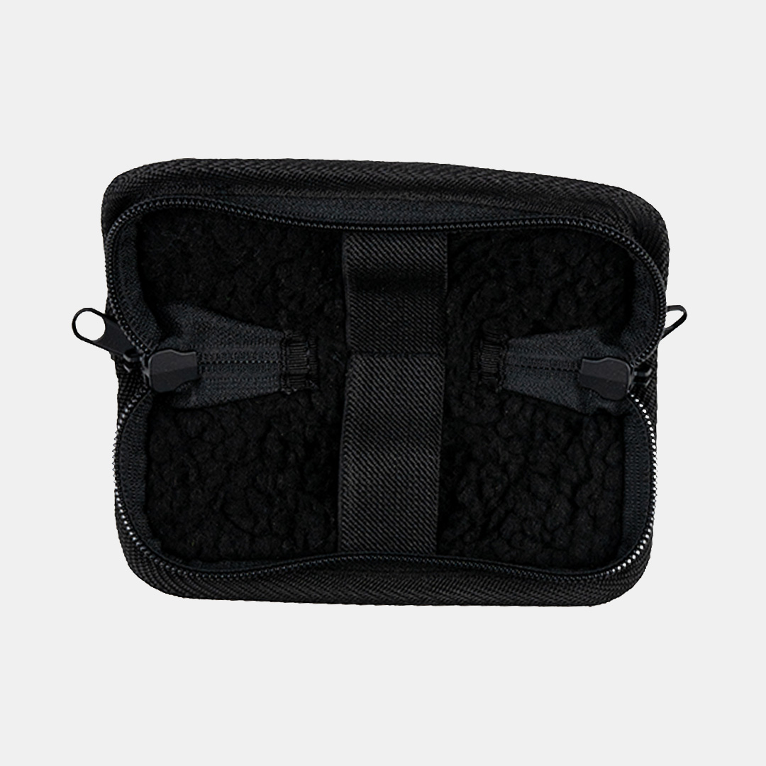 Binnenin zorgen twee elastische banden ervoor dat het mes stevig op zijn plaats blijft en niet kan verschuiven. De pouch kan aan een riem worden bevestigd en beschikt aan de voorkant over klittenband voor het plaatsen van een patch.